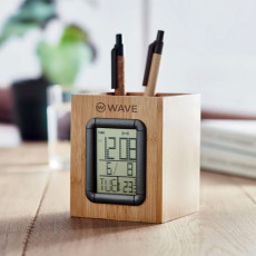 držač za olovke od bambusa sa digitalnim kalendarom, budilnikom i termometromovaj držač za olovke prirodnog izgleda izgledat će sjajno na svakom uredskom ili kućnom stolu. uključene su 2 baterijebambus je prirodan proizvod, mogu postojati male varijacije u boji i veličini po predmetu, što može utjec..